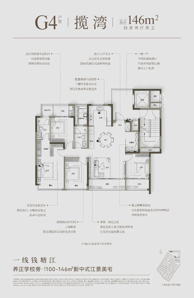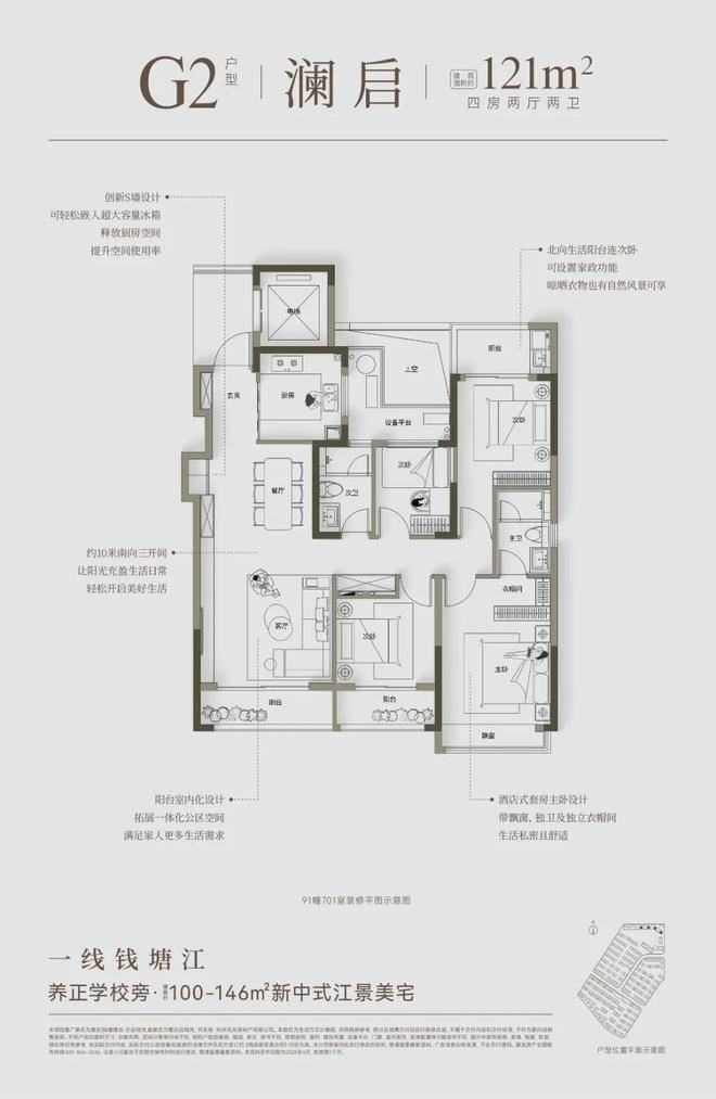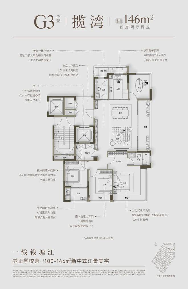 云启钱湾高层分为4种类型,建面约100㎡和建面约121㎡户型,做了创新S墙设计,提高了空间利用率,对年轻家庭来说,也是非常友好的。建面约146㎡四房户型,全部南向面江,大部分楼层还可看到一线江景。