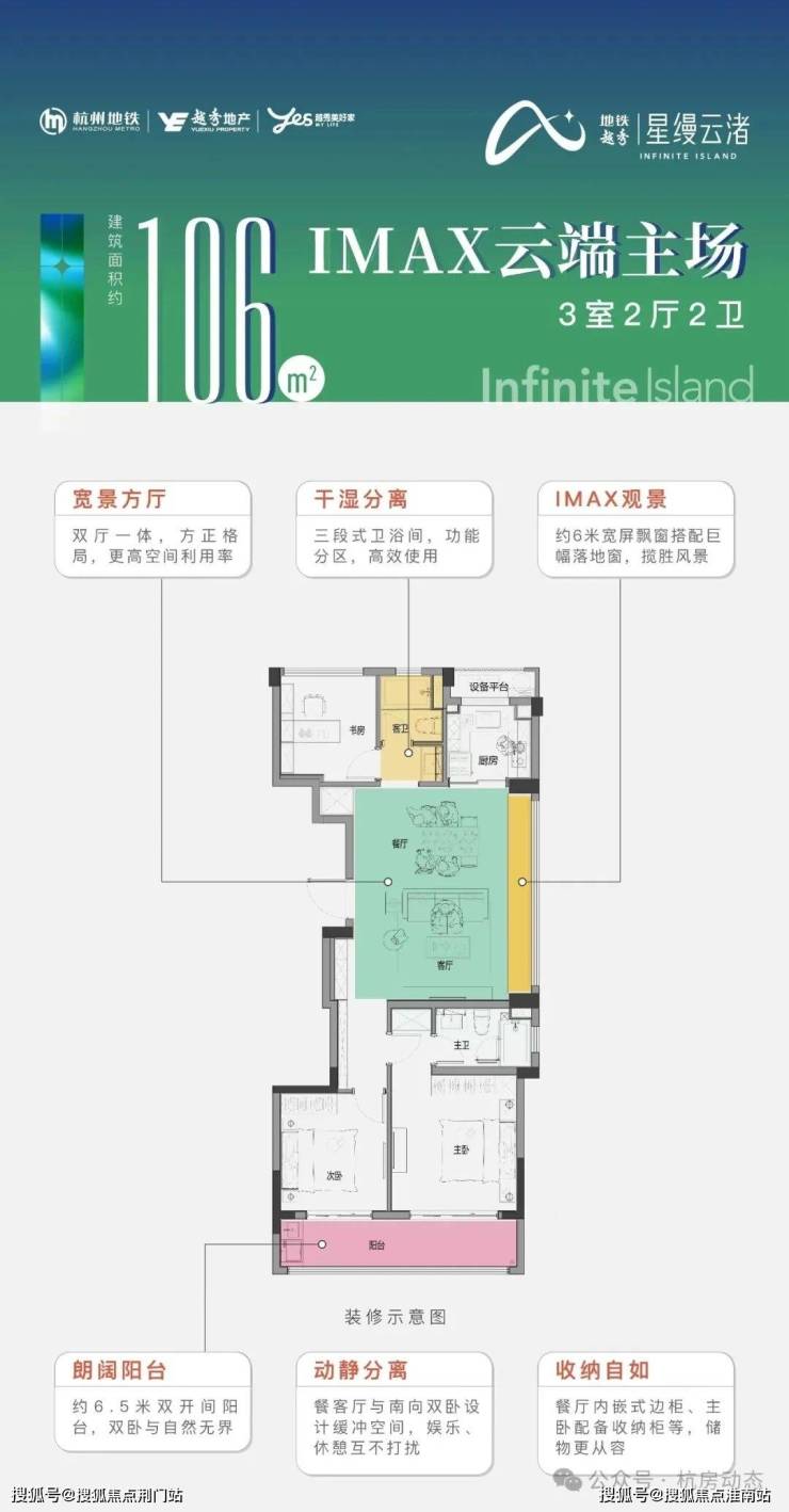 建面约106㎡的户型是市场上难得的小户型边套产品,南向双开间,同样的双联阳台打造,餐客厅一体化设计链接阔景飘窗,充分保证整个房间的采光面,后期居住舒适度更高。