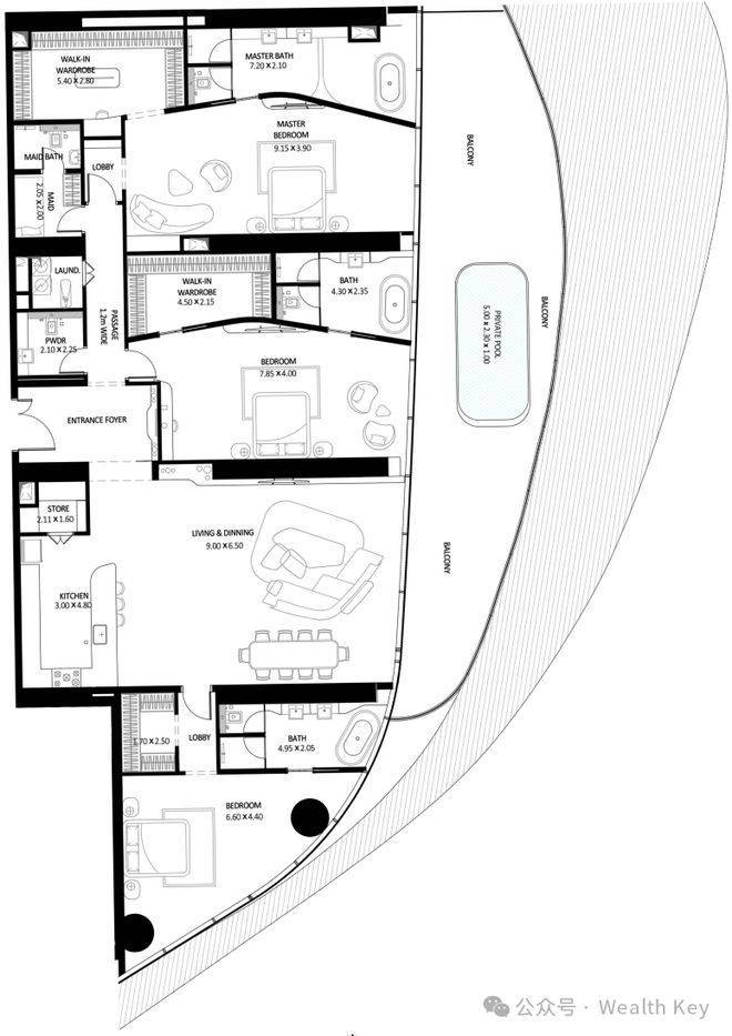 Bugatti Residences每层都采用蜿蜒的线条包裹开放露台,整栋住宅的视觉感受,结合了神秘感、科技感、艺术感。