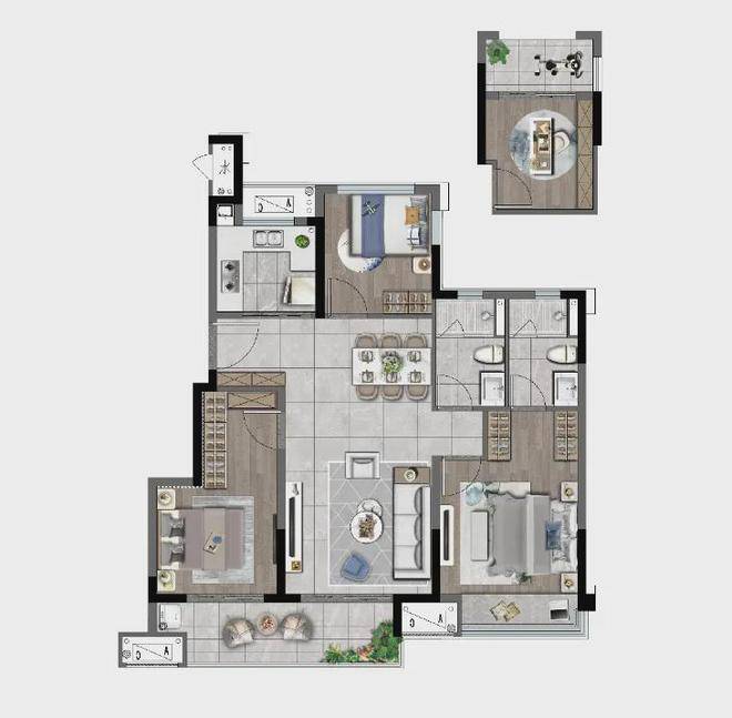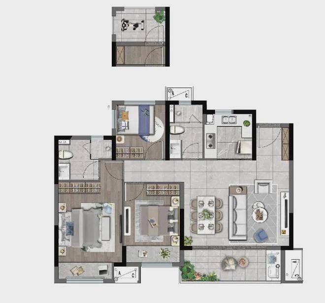 其次,该户型还做到了真正的动静分区。卧室的私密性完全不受公区影响,将舒适度与空间感拿捏得当。