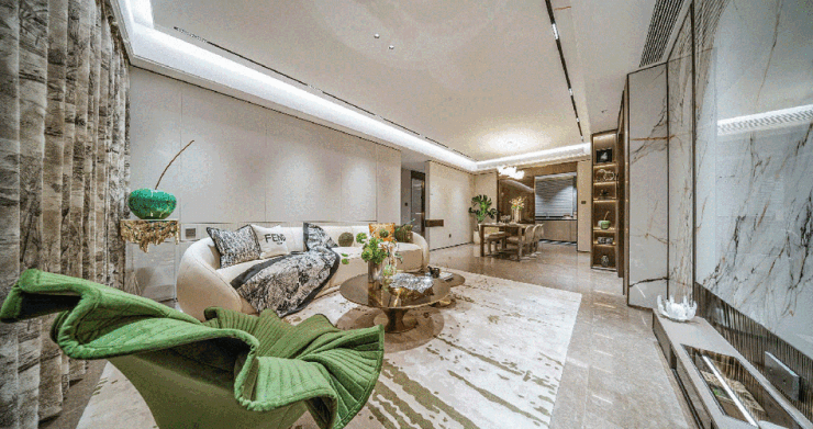 客餐厅、厨房、卫生间、阳台地面铺设的都是塞浦路斯灰天然大理石;电视背景墙一般项目都不交付,项目140㎡户型采用大块岩板.
