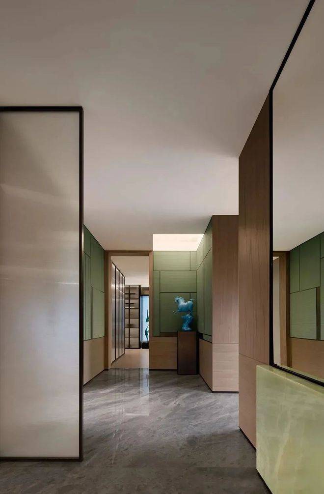 东区建面约320户型,将艺术感进一步融入日常中。特别设计的专属门厅空间,是从电梯厅延伸到家,如同一处艺廊,放慢人的情绪;室内选用了浅金色奢石(外界也称其为“芬迪白大理石”)作为主要的石材,曲面的木饰面也为浅色,整体给人以明亮感。