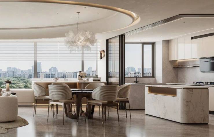 延续客厅的圆弧设计语言,顶面环形吊顶自然延伸,贯通客餐两区;开放式格局摒弃硬性隔断,使空间动线流畅舒展,彻底释放大平层的开阔尺度,实现起居与用餐空间在视觉上的和共生。