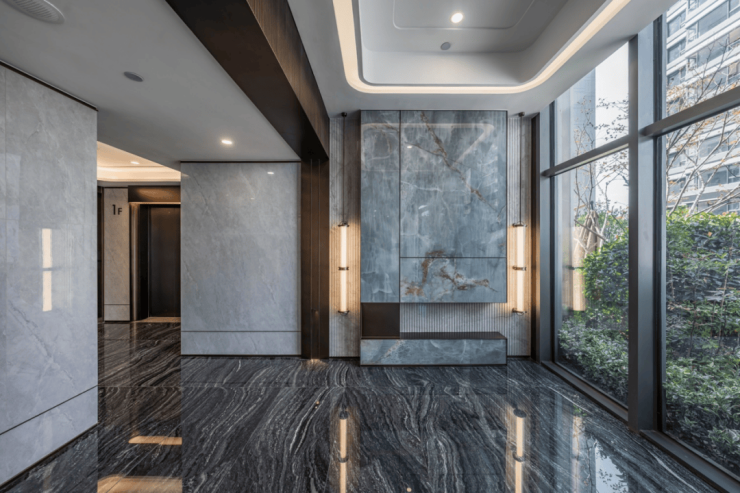 虹桥嘉悦府借鉴国际豪宅灵感,定制卡塔青玉岩板、鱼肚灰石材拉槽造型、门套、古铜色不锈钢饰面,配以大规格云纹地砖和悬浮吊顶,打造高配入户大堂,以专属的优雅艺术品位彰显贵气。