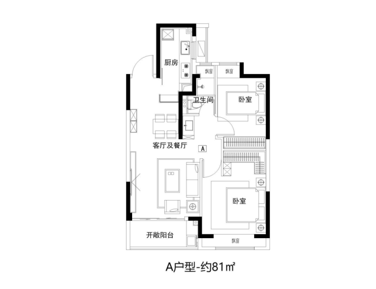 建面约81㎡2房功能齐全,拥有朝南大面宽和全卧飘窗设计。