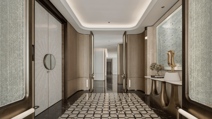 透过鞋柜看向过道,门全部做了到顶的处理,中间的腰线在公共开放区域是整体贯穿的元素,并结合柜门的开启高度,硬包的中线高度等等做了一个整体的联系。