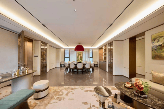 以“隐奢、秩序、质感”为设计核心,将高级审美与人性化考量融于每一寸空间。整体采用低饱和度中性色调,以金属质感点缀,构建沉稳而富有张力的视觉层次,光线经由漫反射柔和铺陈,营造静谧而包容的场域氛围。