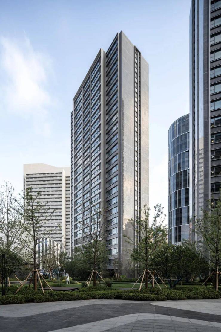 立面材料选取稍显沉稳的“皇室啡”花岗岩,其特殊的颜色与纹理,既能与北侧的办公统一色调风格,也能和周边现有的高容积率建筑,以及绿树成荫的街道环境融为一体,呈现低调精致、简洁大方的高品质住宅形象。