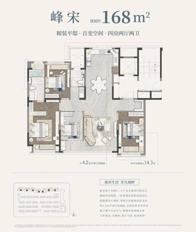 在同样的约168㎡空间内,实现四室两厅两卫完整功能。多出的一房,可以是二宝的独立天地,也可以是先生的书房、太太的茶室——每一种家庭需求,都能找到归属。