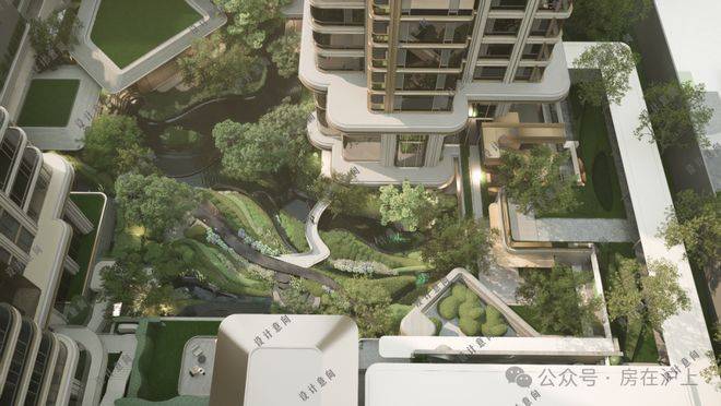三层归家动线 :从地面景观层到架空层,再到入户层,穿越绿植、光影与水景,步步进入私域。