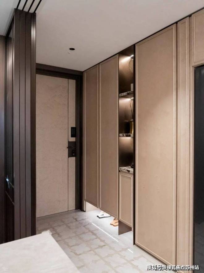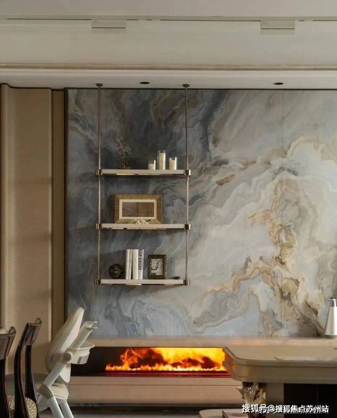 材质与工艺上,100户型的背景墙选用幻日流光岩板,看上去就有一股低调的奢华。