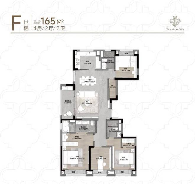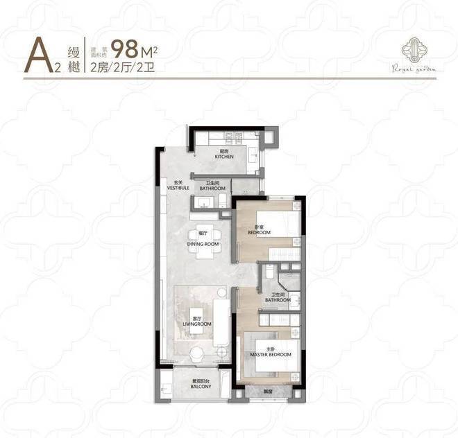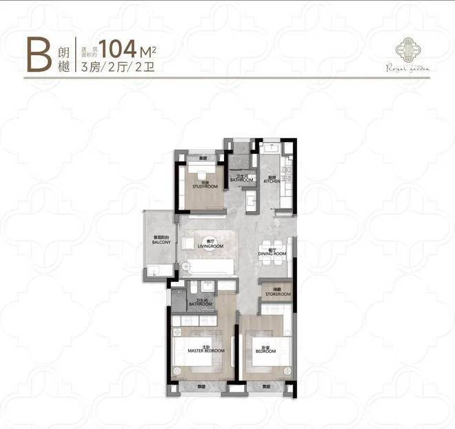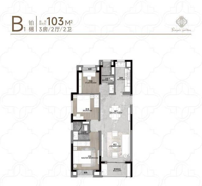 户型得房率75-79%(高于市面74%),建面约98-104㎡三房实现“小面积多功能”(如270°阳台、双套房设计);