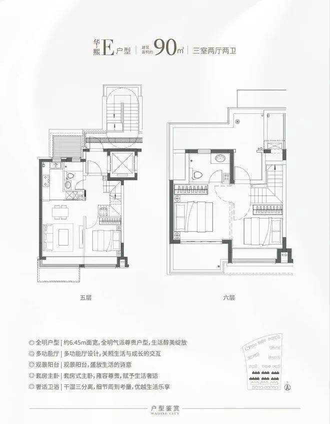 华发还有目前松江比较稀缺的叠加房源,分为六层叠加和四层叠加。主力户型建面约90-133㎡,特别是这个E户型,建面仅约90㎡,对于想住叠加但预算有限的购房者来说,面宽约6.45米,上下动静分离带,是个不错的选择!