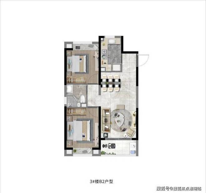 双开间朝南、双卧室带飘窗、动静分离。虽然是小户型,但客厅面宽也达到了约3.5米,带来更宽敞的居住体验。