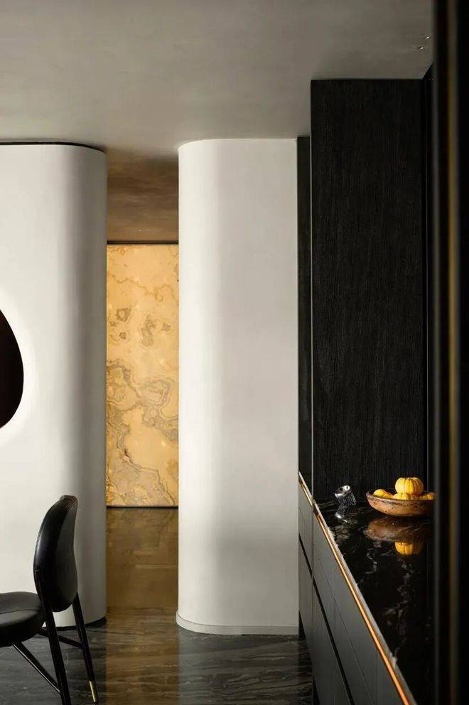 望云庭的立面,采用了豪宅御用的四面铝板,整体造型以钱塘江自然曲线为设计母题,外立面通过香槟金和深灰双色铝板幕墙,配以铂金钻、黑金沙等石材与玻璃弧角工艺,构建出富有张力的几何美学界面。