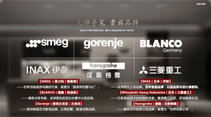 臻选SMEG/劳芬/古洛尼/伊奈/铂浪高/三菱重工/威能/汉斯格雅/杜拉维特等国际一线大牌(具体以商品房买卖合同为准),以至高规格的精装修标准,塑造高颜值、高配置、高舒适度的居住空间。
