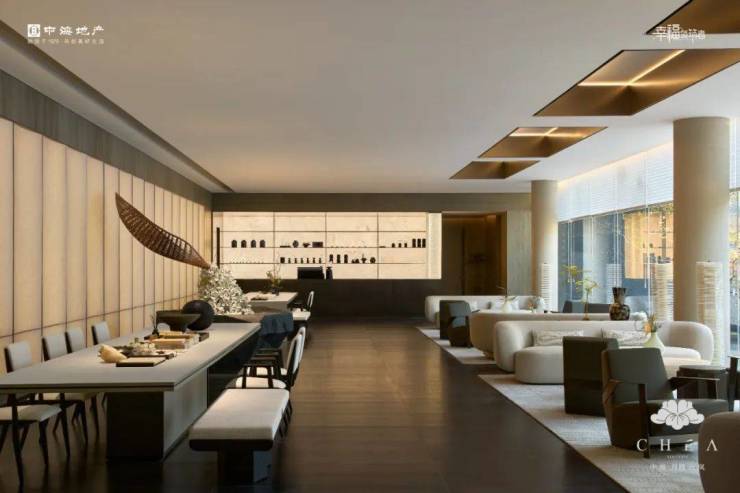 这座水庭也是一整面「水镜」,将中心的乌桕树、周围的超大白玻、精致的艺术雕塑都倒映其中。