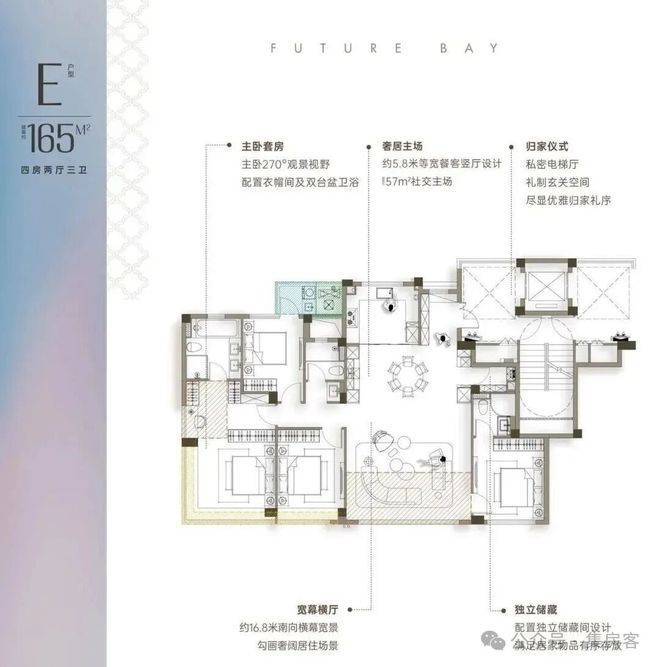 约165方户型,16.85米超大南向开间,超过市场所有同面积段产品;标配储藏间。