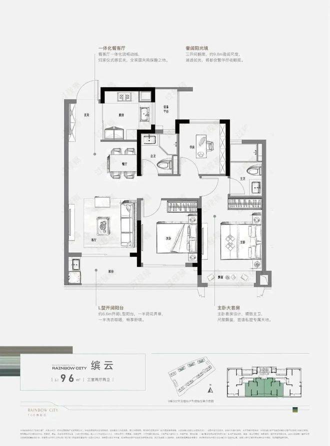 像建面约96㎡户型,整体三开间朝南设计,约9.8m奢阔尺度,户型方正大气,明亮通透,动静分区,再加上约6.6米开阔L型阳台,轻松实现一半洗衣晾晒、一般诗意生活的美妙画境。虹缤之都售楼处电话☎:400-8558-224✔✔✔【预约☎】
