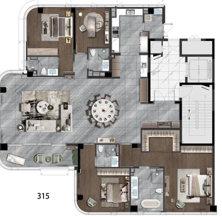 4栋17层“超级游艇”式建筑,主力户型310-350㎡,层高3.15米