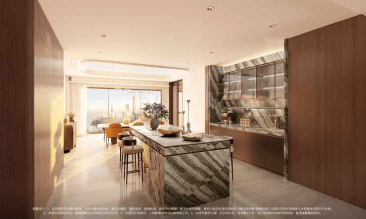 西厨吧台更是匹配了符合空间调性的东方木纹与龙飞凤舞石材,独特的纹理和质感提升了厨房品质与艺术性。