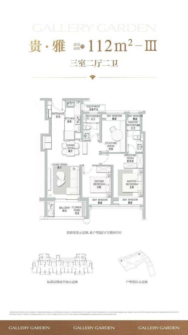 项目舍弃了传统逼仄的百平三房,将最小面积提升到了建面约112㎡,而这12个平方的提升,让整体户型的空间尺度感达到了新的高度。