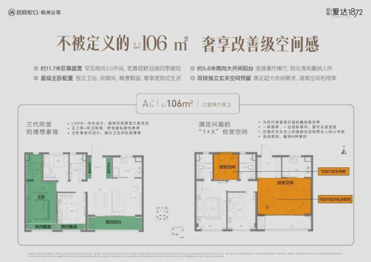 首先,这套建面约106㎡户型,首推创变空间,整个户型南向面宽达到了惊人的约11.7米。