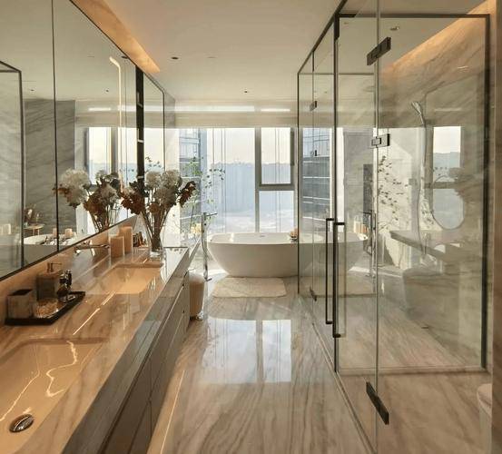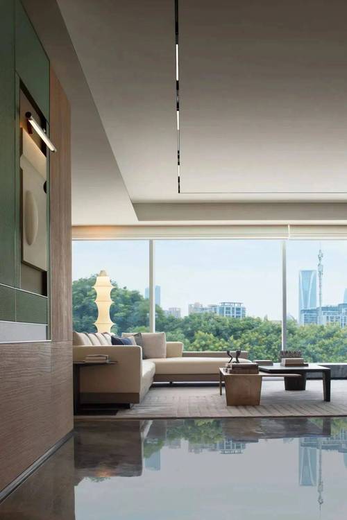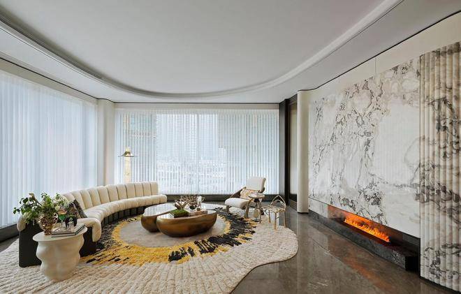 将艺术感进一步融入日常中。特别设计的专属门厅空间,是从电梯厅延伸到家,如同一处艺廊,放慢人的情绪;室内选用了浅金色奢石(外界也称其为“芬迪白大理石”)作为主要的石材,曲面的木饰面也为浅色,整体给人以明亮感。