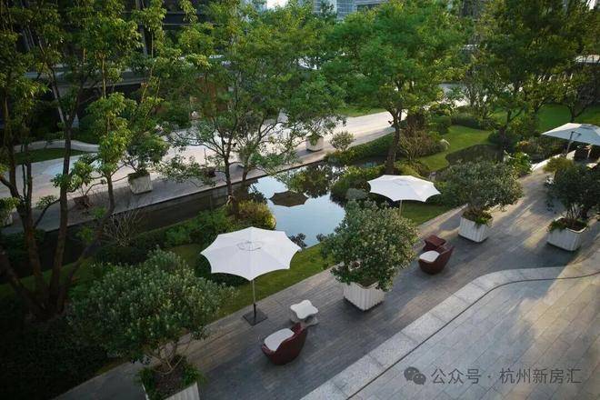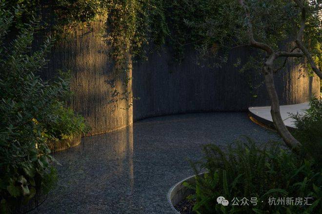 走入T-ONE潮博西区的园区,可以看到一条蜿蜒的水系串联着不同场景,贯穿整个楼盘。在这里,Pok是结合了杭州「钱塘江潮」的在地文化,用溪流与叠水打造出了一座很有度假感的花园。花园中,凡是有户外座椅的地方,就会有微风、树荫与水流的环绕。