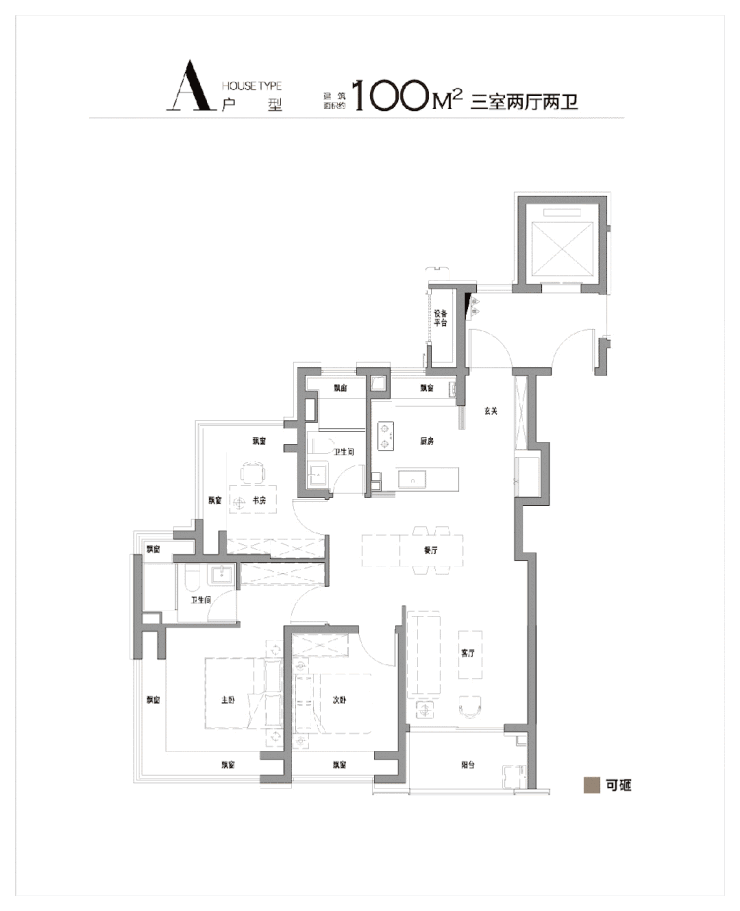 100㎡户型,双270°飘窗设计(南向主卧+北向书房),南次卧、厨房、双卫飘窗,厨房烟道外移,飘窗配置抽屉,极致空间利用率。