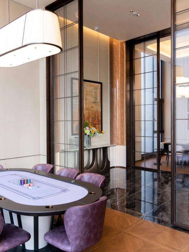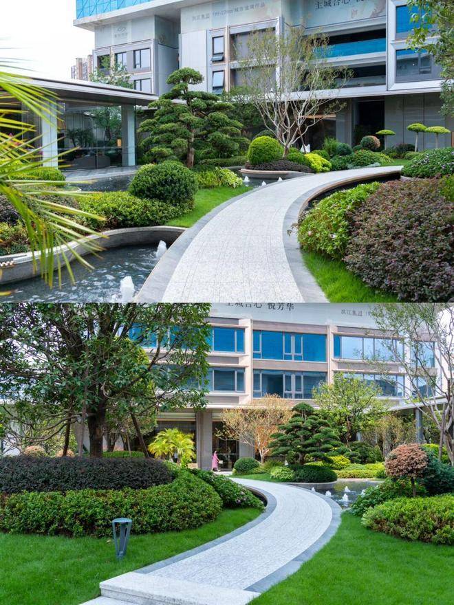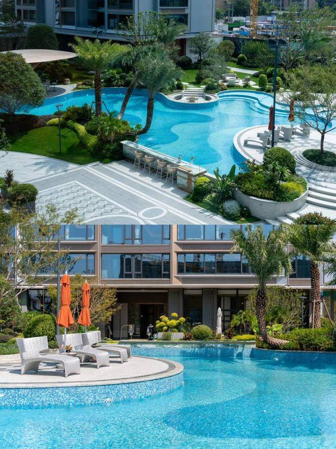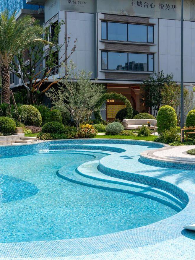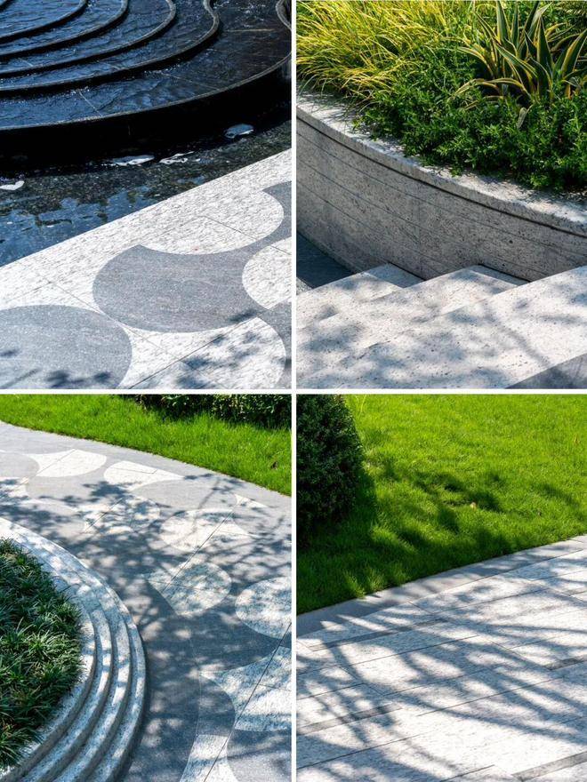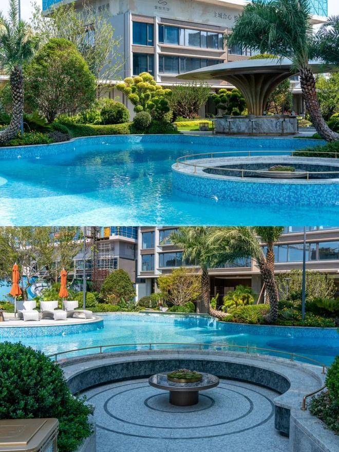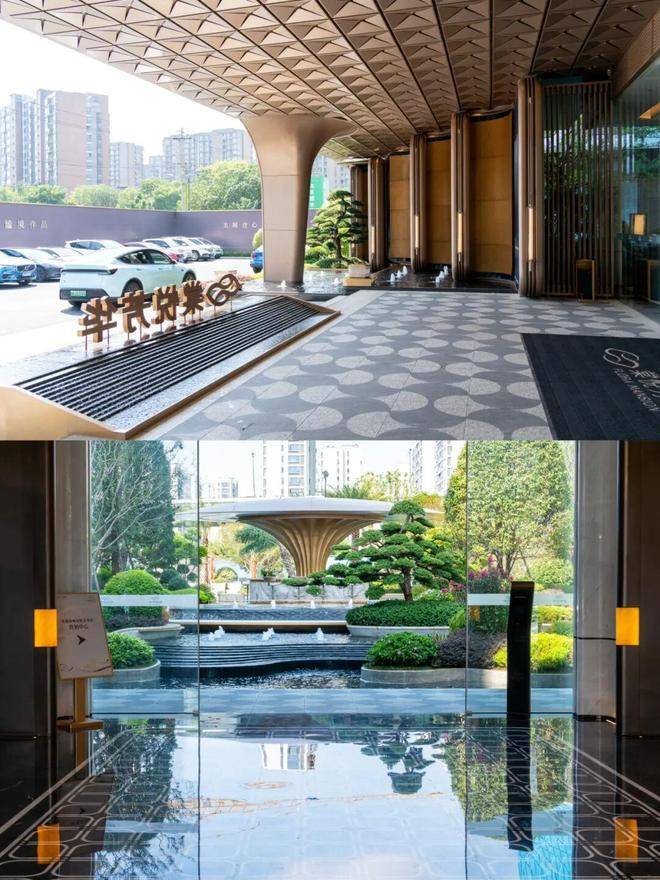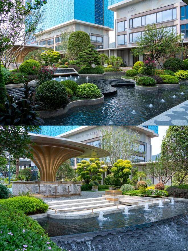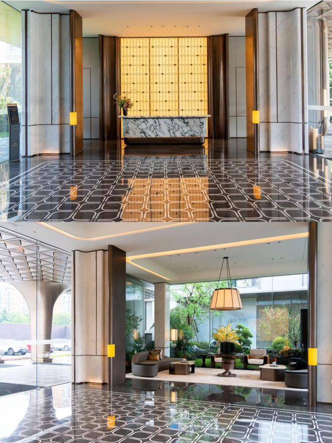 园林设计灵感源自珠宝品牌CHAUMET,以“繁花造型珠宝”为理念,设计了“一轴、一带、两芯、八境”的景观结构,包含了迎宾水院、戏水池、特色苗木和休闲卡座等,旨在营造度假般的园林体验。