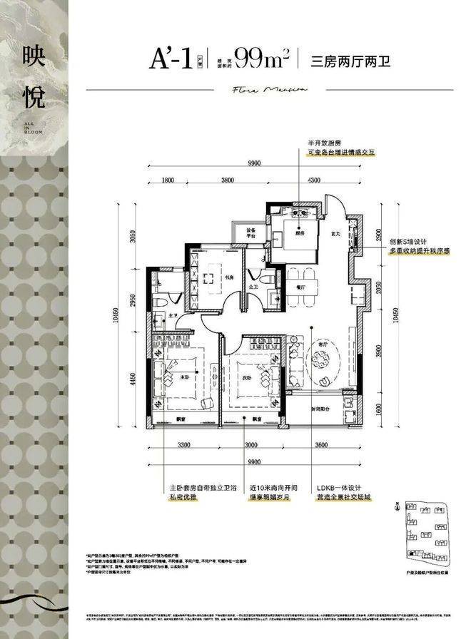 户型覆盖建面约99-139㎡的三房和四房。例如约99㎡的三房两卫户型做到了三开间朝南;约139㎡的四房两卫户型则设计了南向三卧室和双飘窗。