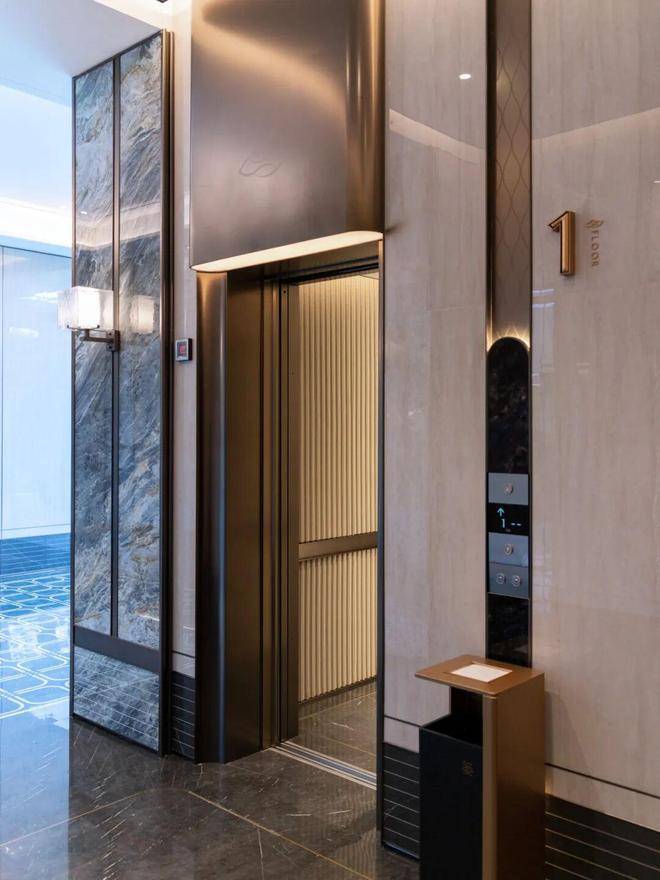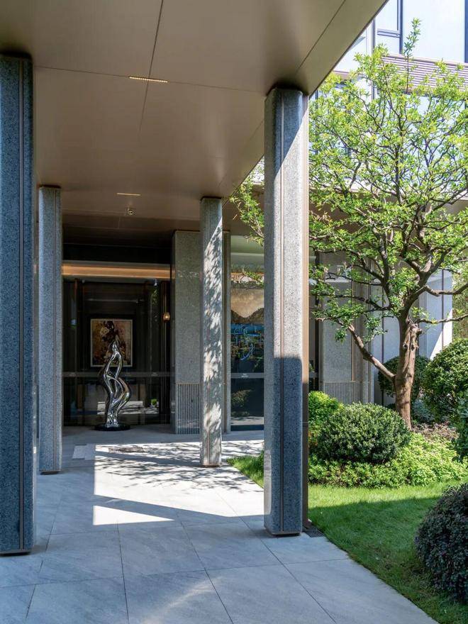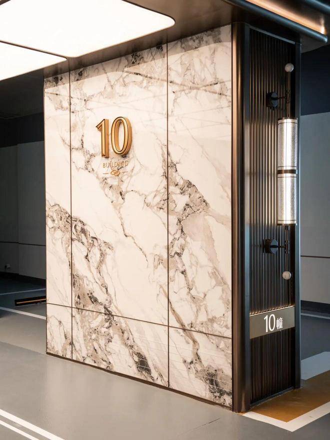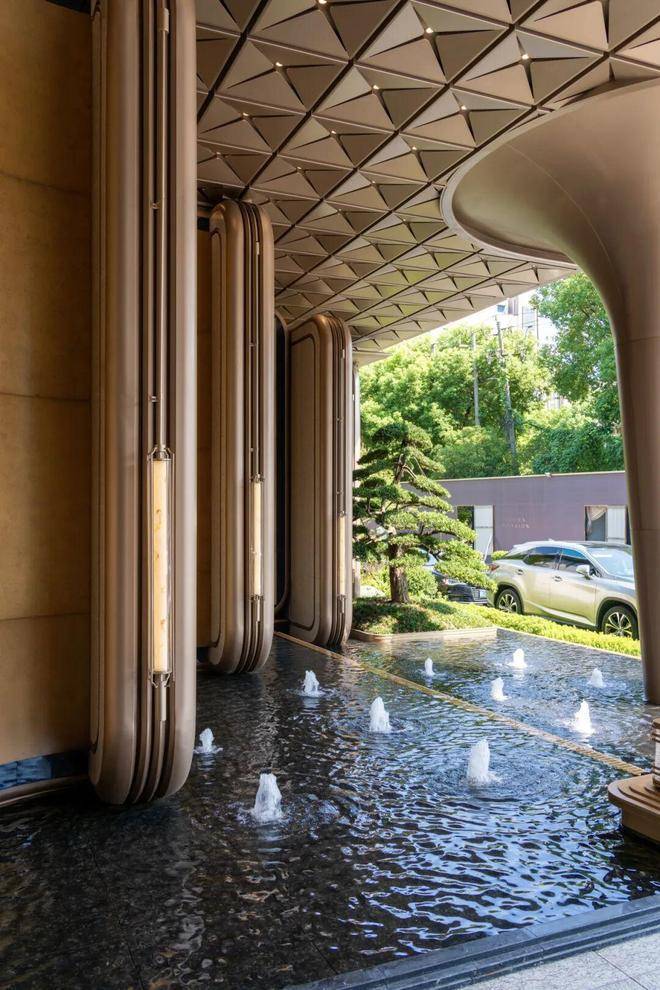 滨江棠悦芳华轩小区的归家大门设计注重仪式感和归家体验,采用了星级酒店的设计标准,运用了精细拉槽的石材、仿铜不锈钢以及宝石蓝釉面陶板等材料,旨在营造大气开阔的入口形象。