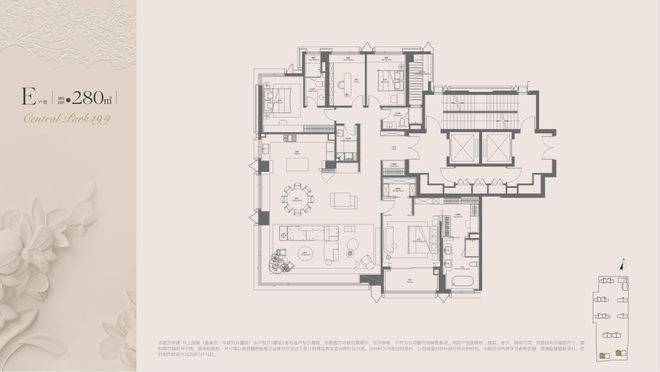 设计为三房,两间为套房,北次卧亦接近套房配置,尊崇感十足。超大南向面宽与巨型横厅赋予空间极高灵活性,可适配书房、瑜伽室等多重场景。