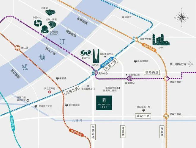 地段优势:紧邻滨江区,距奥体中心约3公里,周边聚集滨江银泰、星光大道等7大商圈,浙师大附属博奥小学一路之隔