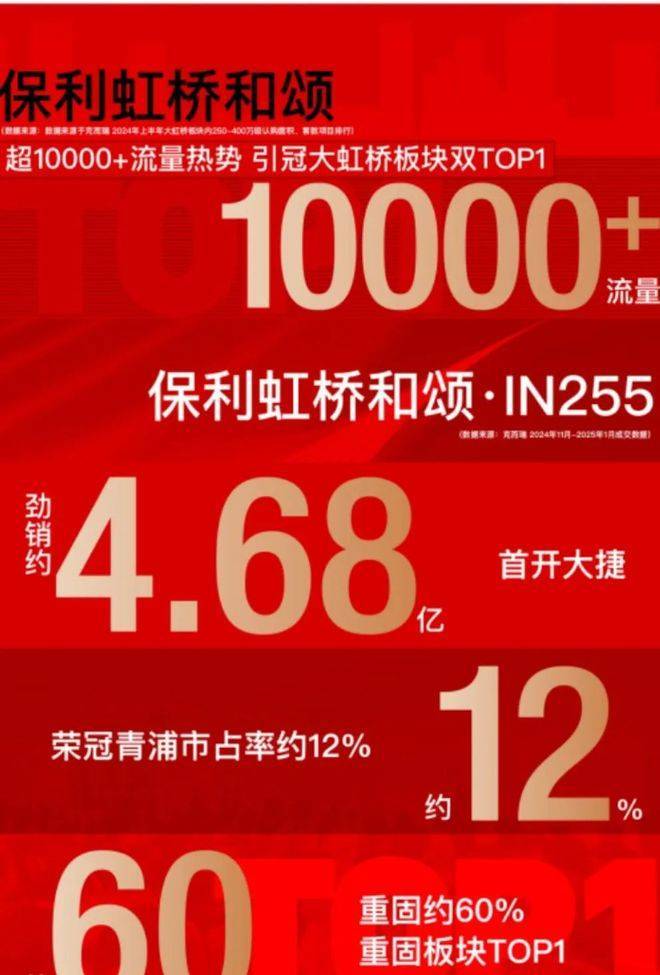 面对市场预期升温窗口期,保利虹桥和颂·IN255以300万级精奢三房、500万级改善四房迭代升级产品,强势锚定板块进阶需求,首开即强势斩获4.68亿元业绩,更以单盘青浦约12% 、重固板块约60%市占率,焕新激活板块价值跃迁。(数据来源:克而瑞2024年11月-2025年1月成交数据)