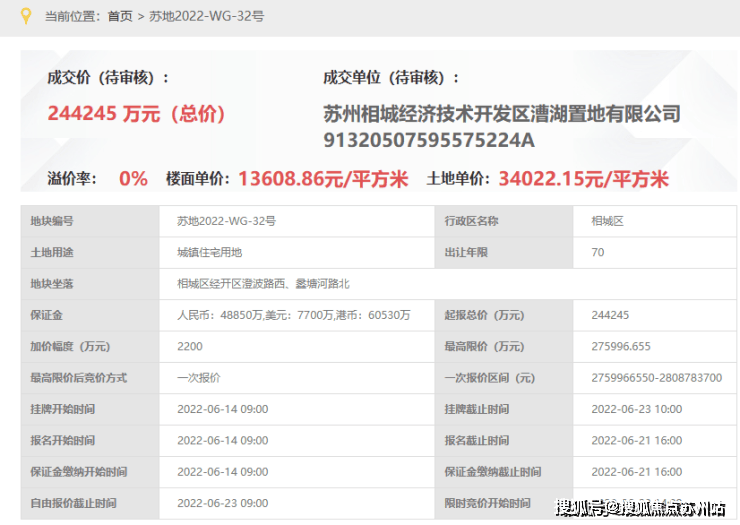 龙湖·峯云境即苏地2022-WG-32号,位于相城经开区蠡塘河路与澄波路交汇处。该地块由漕湖置地在2022年6月23日底价竞得,成交总价244245万元,成交楼面价约13609元/㎡。