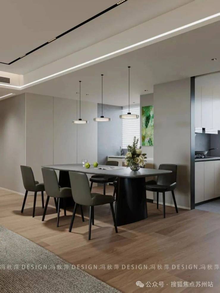 餐厨区域与客厅以开放式格局相连,却通过巧妙的设计手法,自然勾勒出相对独立的用餐天地。一张长形餐桌以灰色石材为面,细腻的纹理如天然的艺术画作,尽显沉稳大气。搭配深灰皮质餐椅,利落的线条纵横交错,为空间注入一份利落与干练。三盏环形吊灯垂坠而下,暖黄的光晕温柔地倾泻在餐桌上,为每一顿餐食赋予了仪式感。餐桌上,精心摆放的花艺与青苹果摆件相映成趣,灵动的气息弥漫其间,让这个餐厨区处处流淌着生活的温度。