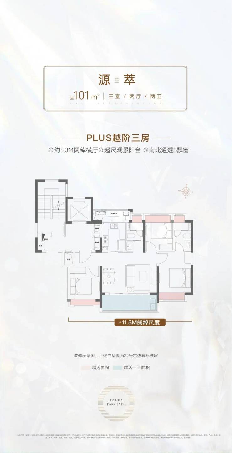 现场开放的是建面约101㎡三房拥有约5.3米横厅,一梯两户设计之外每个房间都设计有飘窗空间更大: