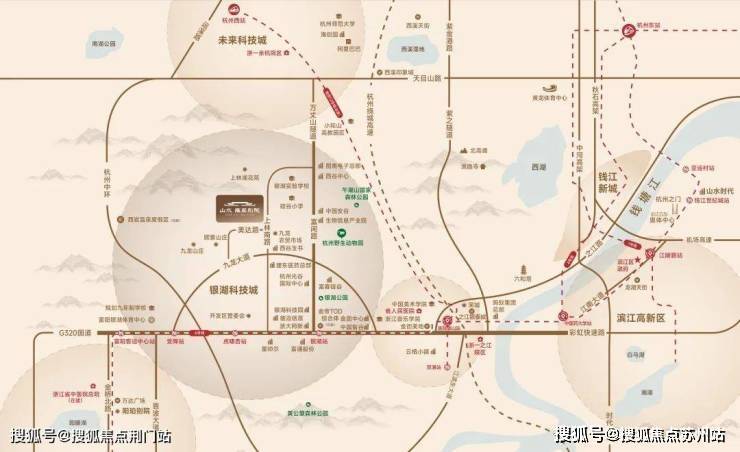 项目位于银湖科技城融杭门户,抢占交通资源高地,约1500米连接杭州地铁6号线虎啸杏站,瞬达杭州主城核芯。毗邻G320国道与彩虹快速路西延段,形成快速融杭交通走廊。