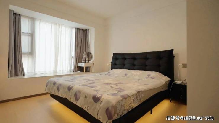 卧室通过黑、木、白三色构建出既沉稳又温润的休憩空间。黑色软包床(视觉重量100%)+原木地板(重量60%)+白墙(重量20%)营造悬浮感,此搭配使12㎡卧室获得15㎡的空间感知。
