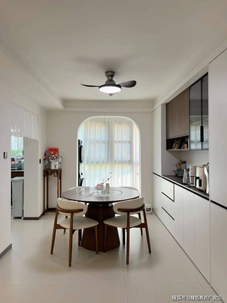 当夏季风扇低转速时,风扇灯将热浪切成薄片,光影在墙面投下动态复古电影胶片效果;靠墙定制整面收纳柜,其中开放格占比30%,用来展示业主淘来的好物件;而相比长方形餐桌的主客之分,圆桌消除等级感,还原家庭聚餐的平等氛围。