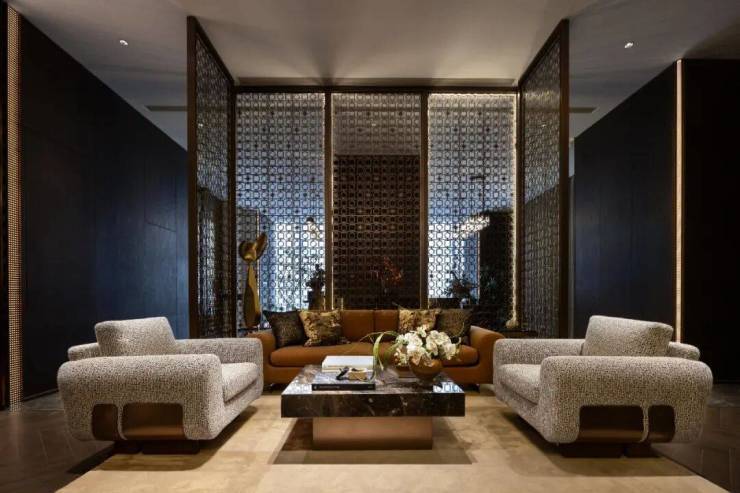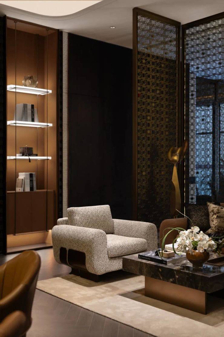 深褐墙面与金属屏风交织,勾勒出空间的精致边界。暖棕沙发如温柔怀抱,水晶灯洒落清辉,与桌上繁花相映。在此处,喧嚣被阻隔,每一寸光影都在诉说静谧的奢华,是邂逅从容与雅意的私享天地 。