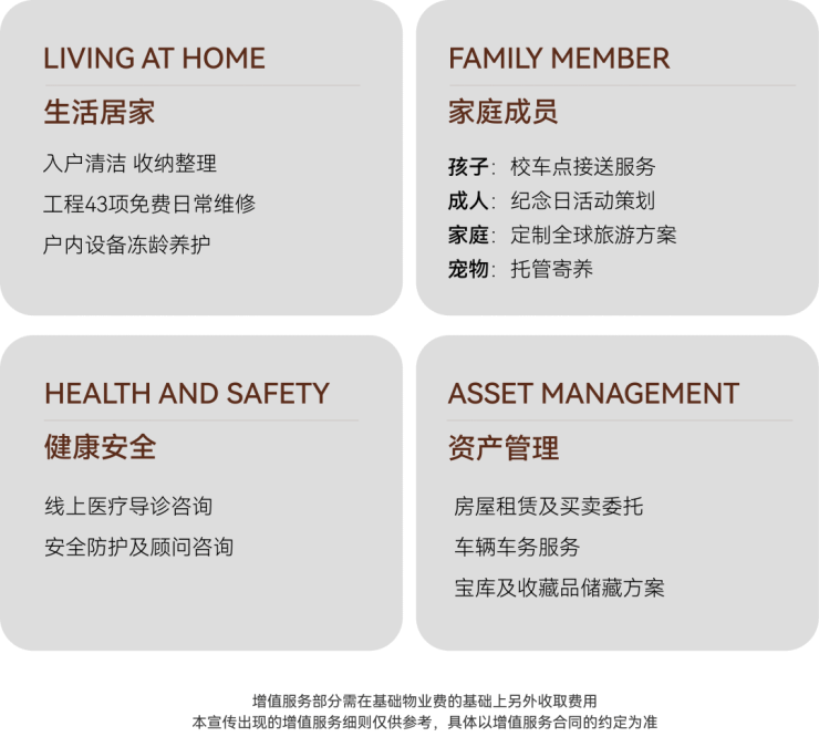 古北99迭代升级古北的生活方式,同源世界奢华酒店基因,从时间、空间、私属三个维度,共280余项标准化服务细则着手,打造自然无痕的服务内容;并充分考虑当代高净值业主需求,提供日常居家服务、健康安全、资产托管等增值服务,如包含儿童接送服务、入户保洁、43项免费日常维修、宠物托管、私人定制全球旅游方案、车辆养护代检等。
