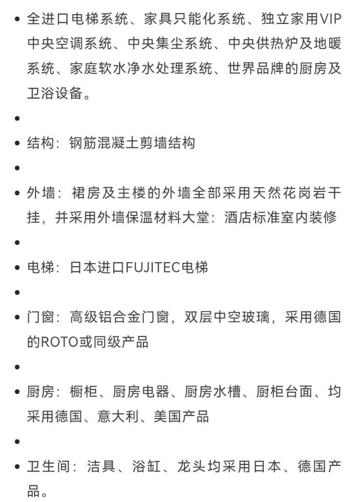 统一豪华精装修,门窗采用高级铝合金与双层中空玻璃,搭配德国ROTO或同级产品;配备家居智能化、独立家用中央空调、中央集尘、中央供热炉及地暖、家庭软水净水处理等系统;厨房、卫浴设备选用德、意、美、日等世界品牌,从外到内彰显豪宅气派,将生活品质融入每一处细节。