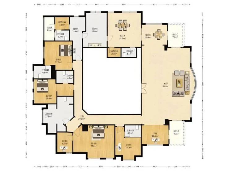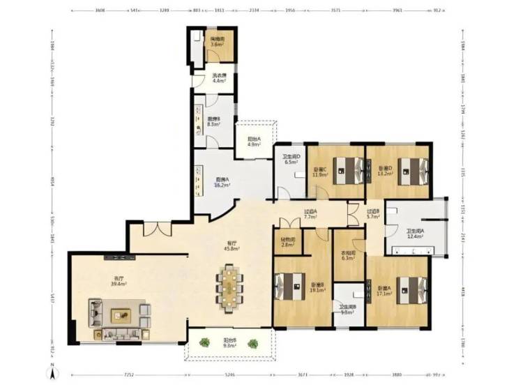 -3号楼02室:276㎡,4房2厅3卫,客厅南北通,两房朝南两房朝北,尺度宜人。