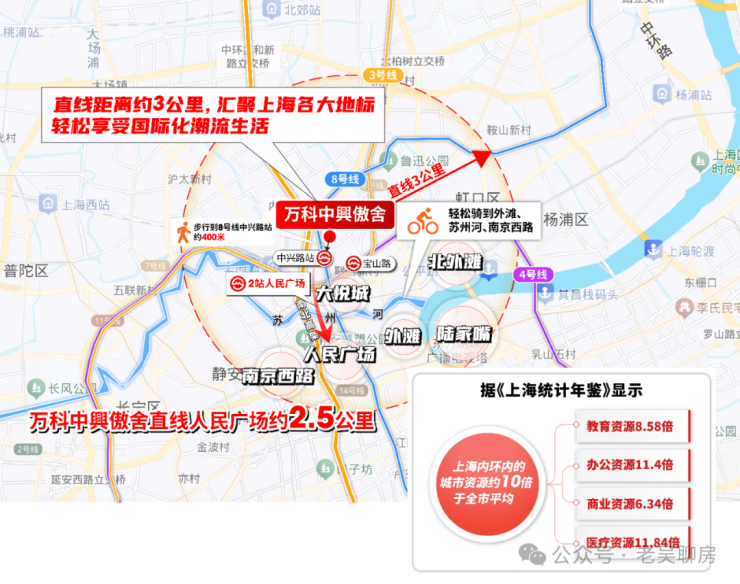 离传统市中心越近,资源密度越浓。中興傲舍离8号线中兴路站步行只有约400米,2站人民广场(直线距离约2.5公里),直线距离约3公里覆盖南京西路、静安寺、南京东路、陆家嘴等核心板块,中興傲舍与市中心资源深度绑定。