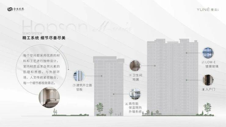 现代典雅立面,灰色搭配香槟金的色调,彰显不同建筑审美,外立面为品质铝板+玻璃幕墙,局部干挂石材和保温一体板,通过数控切割、精度弯弧、手工焊接、打磨抛光、七重清洁、烘干喷漆、高温定型等过十余步精细工艺,是高端住宅中品质最高的立面铝材。