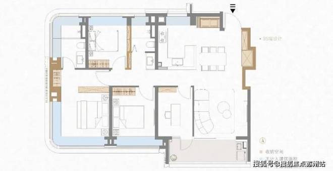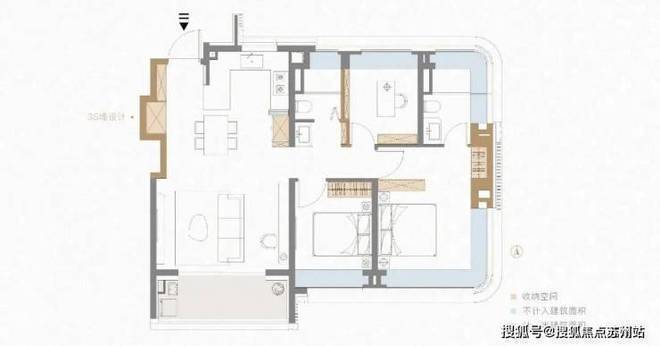 这个户型有独立电梯入户,保障私密性的同时,还多了一个独立都电梯厅,相当于多了一个小厅,可以用来规划摆放收纳柜,变相提高了“得房率”
