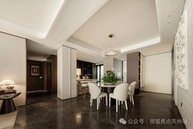 客厅背景墙的“烟雨江南”天然大理石,不同于传统平面背景墙,通过弧度及立体的造型处理,并镶嵌不锈钢材质,对于金茂而言,比奢石昂贵的,是让奢石真正与空间气场融为一体。